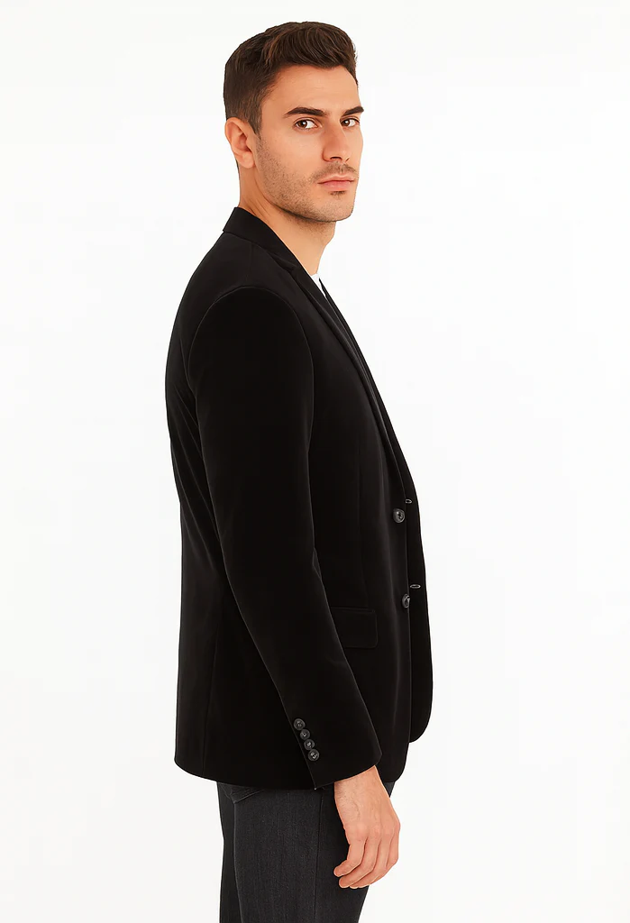 Ethan Foster-Â This black velvet blazer is absolutely sleek and stylish! The modern fit gives a sharp, tailored silhouette. The fabric feels soft and luxurious. Perfect for formal dinners, parties, or evening events.